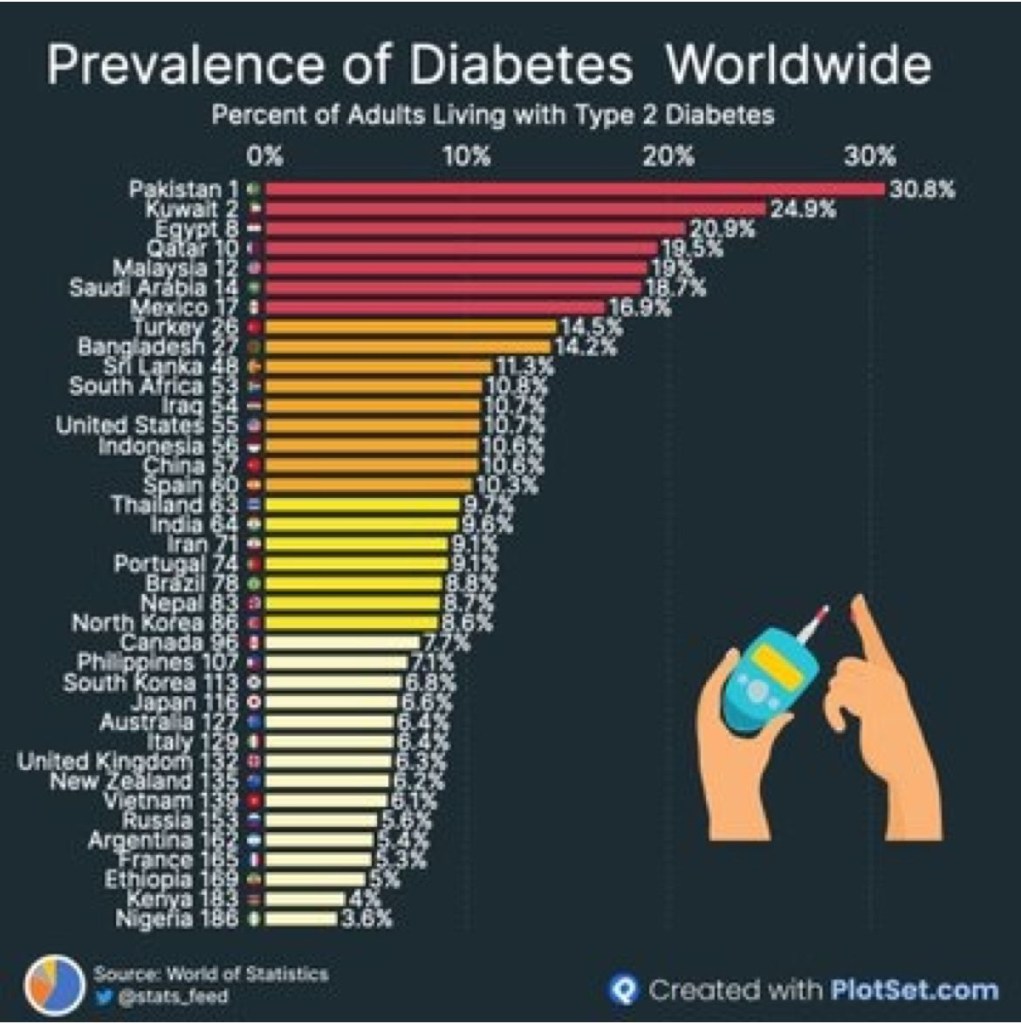 The recent statistics on diabetes rates in the world, i.e., % of people age 20-79 who have type 1 or type 2 diabetes, are alarming. Unfortunately Pakistan tops this list with about 30% rate (Source: World of Statistics).